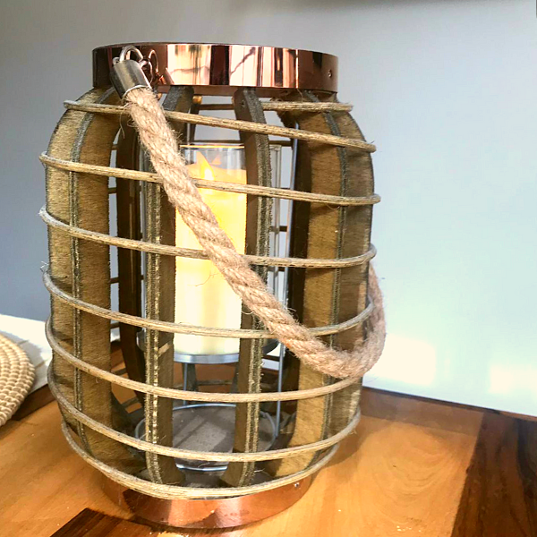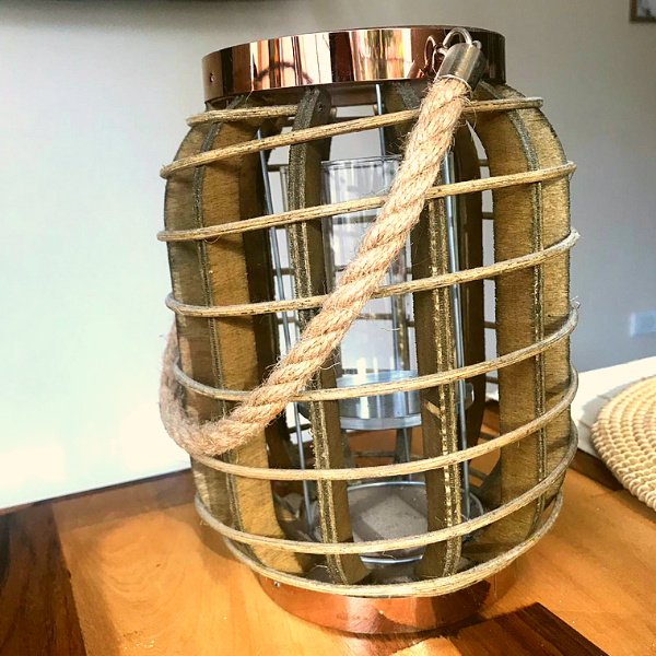 Farol de Madera , yute y detalles de cobre de 15 de ancho x 24 cm de alto.