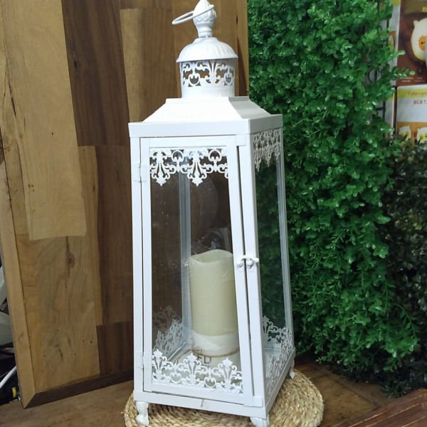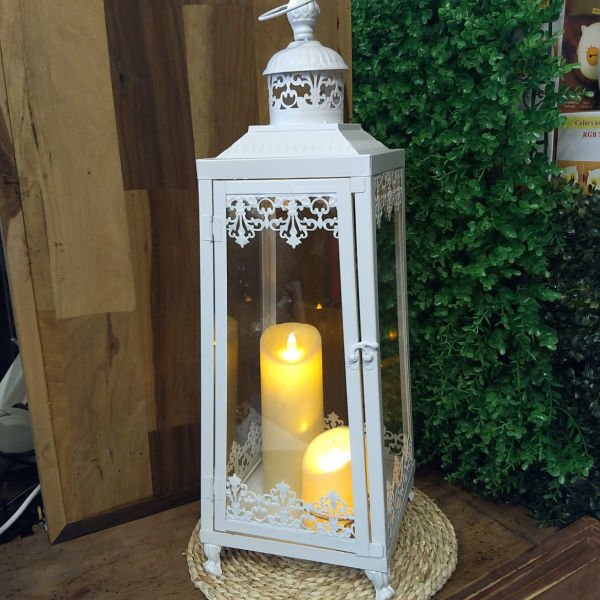 Farol porta vela metalico antique blanco mate grande de 60 cm de alto