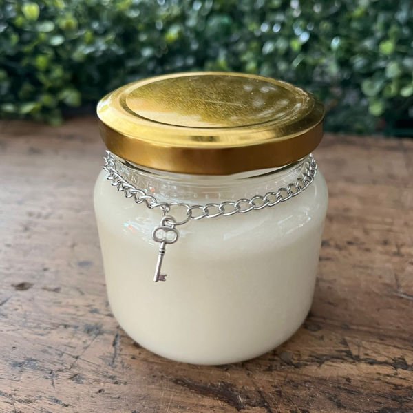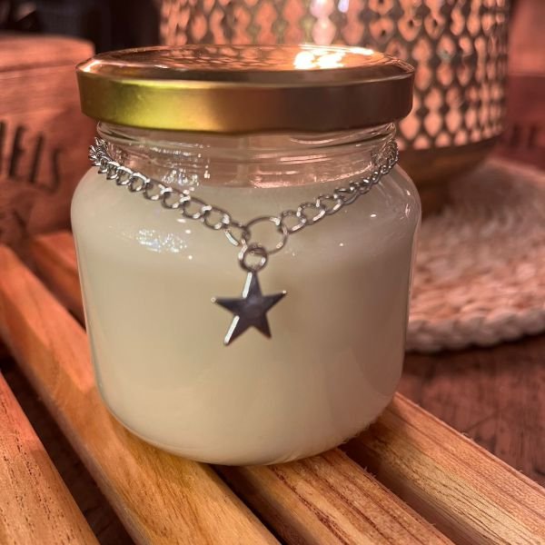 Vela en frasco de cera soja con pabilo de madera, ideal para aromaterapia en varios aromas