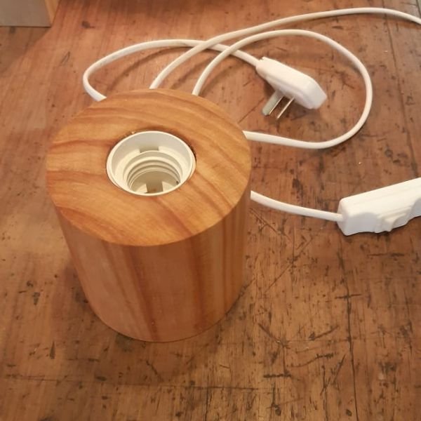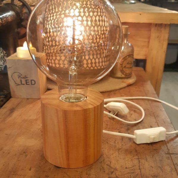 Velador deco artesanal de madera con forma cilíndrica.